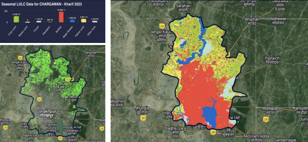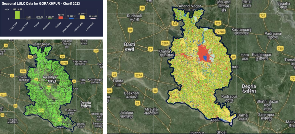 A satellite-based agricultural monitoring system and interactive digital dashboard have been developed to visualize crop information at State, District, Block, and Gram Panchayat levels. This platform enables government departments to monitor cropping patterns, assess crop conditions, and support timely policy decisions.